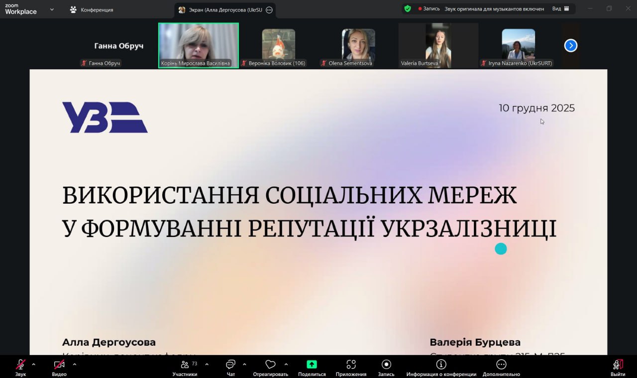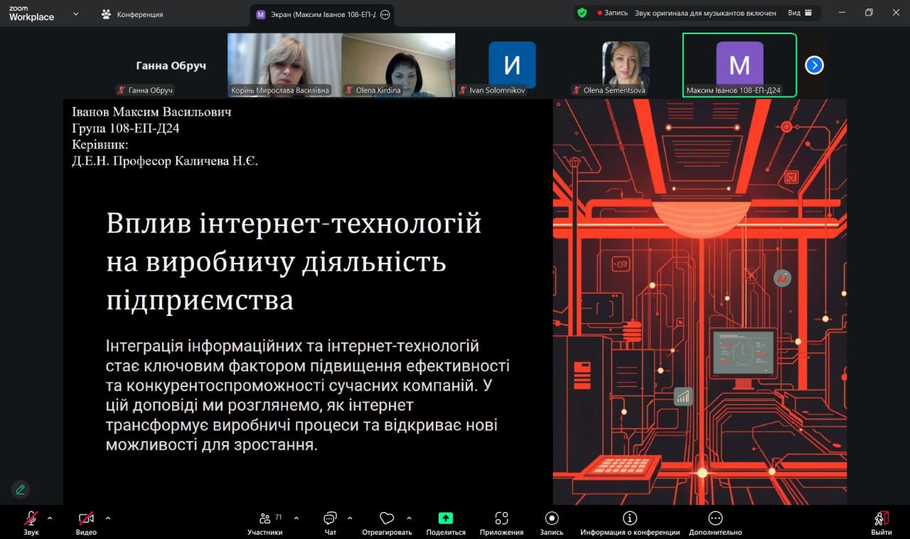 У конференції прийняло участь понад 70 осіб. Власні напрацювання презентували молоді дослідники, які вже сьогодні формують майбутнє науки. Серед виступів: «Вплив інтернет-технологій на виробничу діяльність підприємства» студента гр. 108-ЕП-Д24 Максима Іванова, «Ризики функціонування логістичних систем в умовах воєнного стану» студентки гр. 106-МОА-Д22 Вероніки Воловик, «Використання соціальних мереж у формуванні репутації Укрзалізниці» студентки гр. 215-М-Д25 Валерії Бурцевої, «Поточний стан, проблеми та перспективи розвитку платіжних систем в Україні» студента гр. 133-ФС-Д23 Дмитра Гаврилюка.