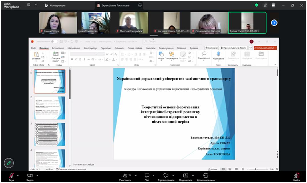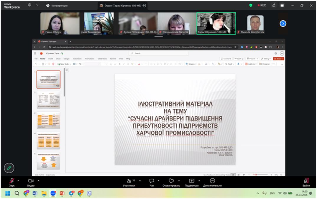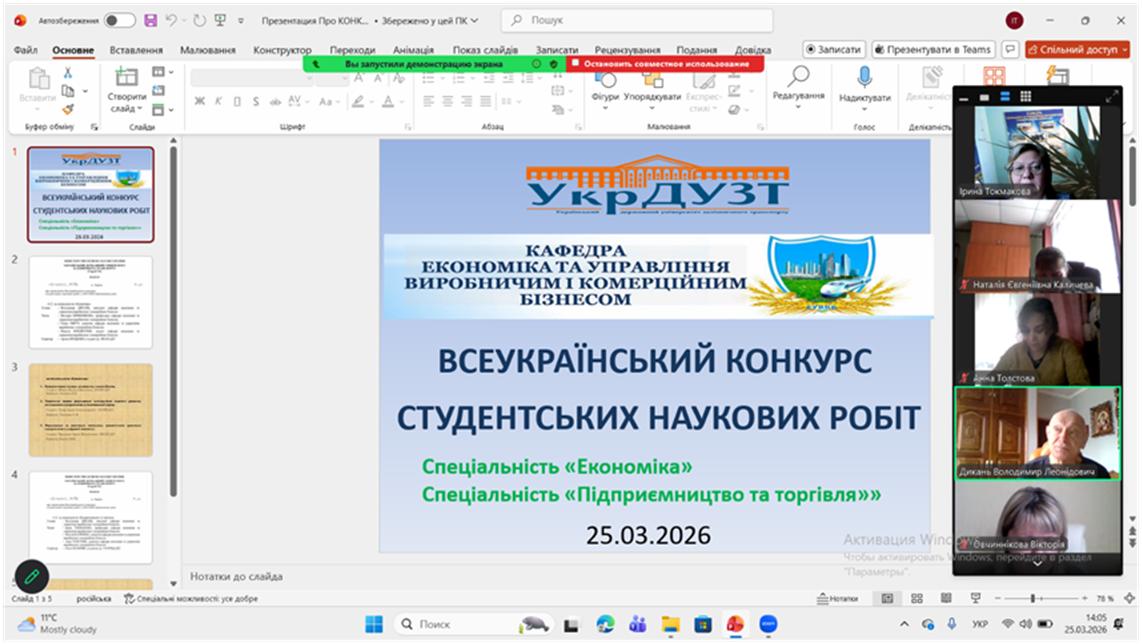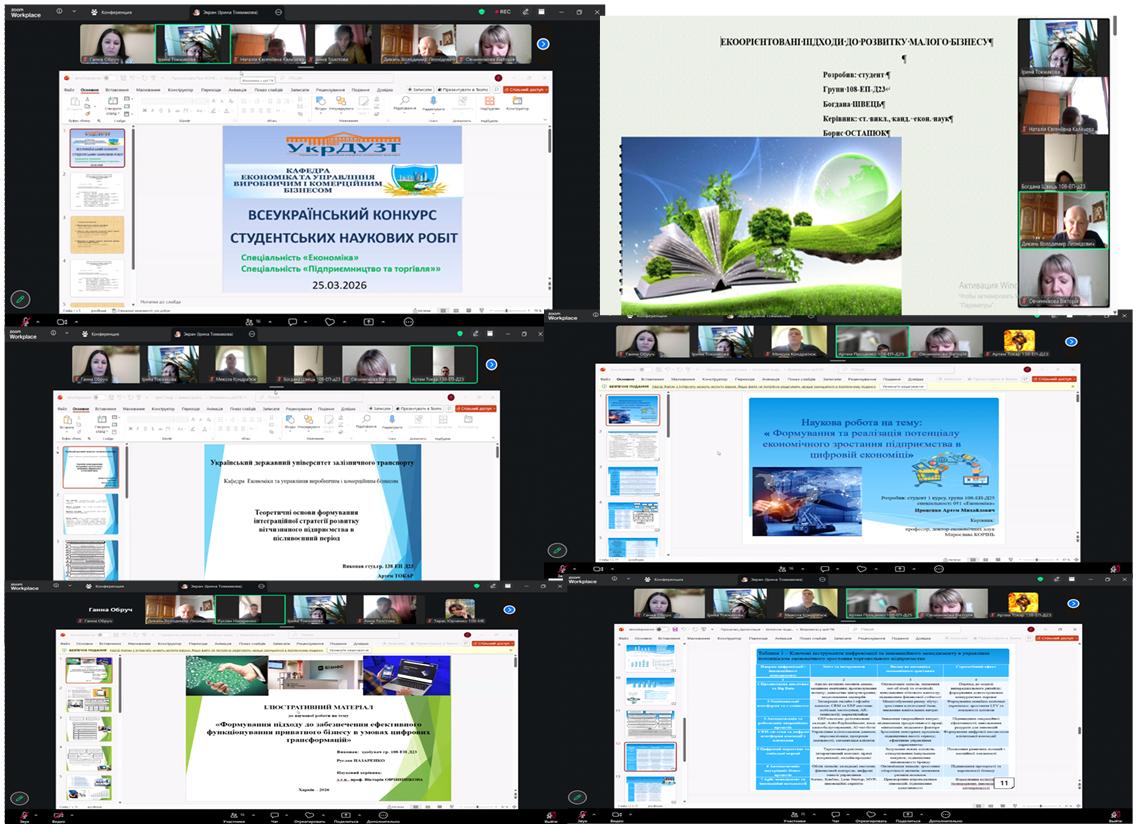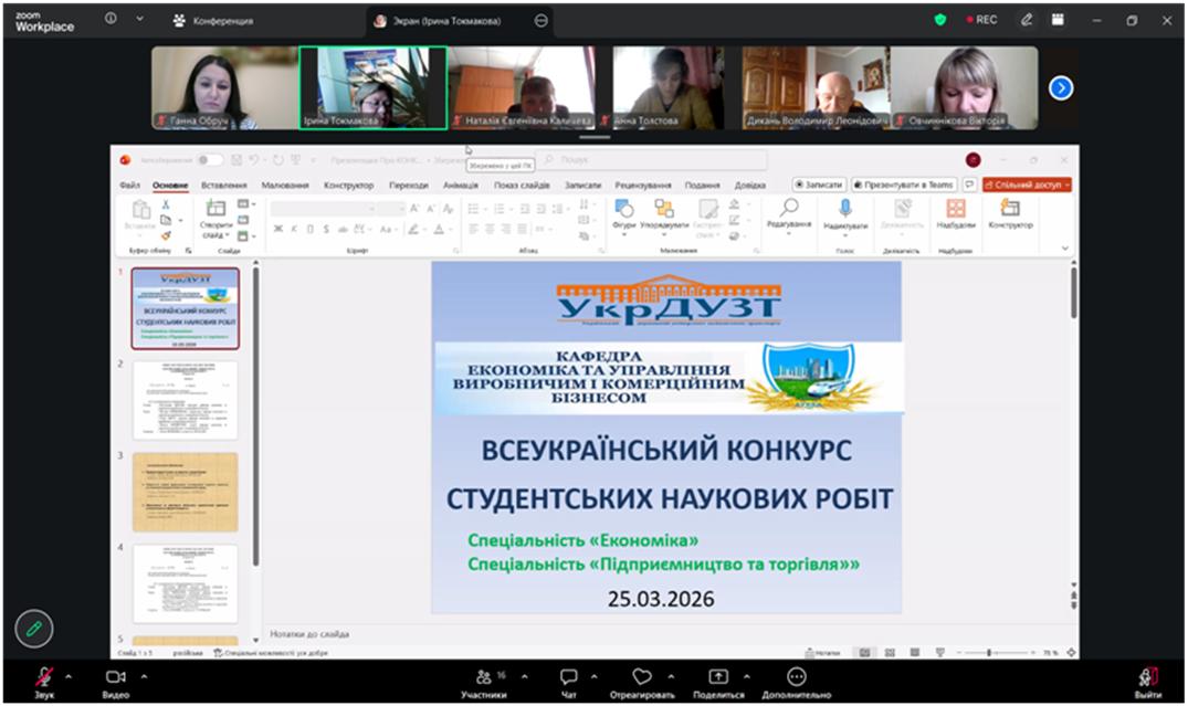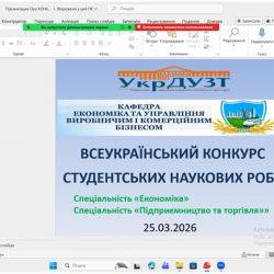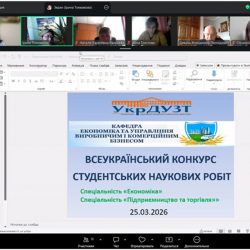 25 березня 2026 р. на базі кафедри «Економіки та управління виробничим і комерційним бізнесом» Українського державного університету залізничного транспорту відбулася підсумкова конференція І туру Всеукраїнського конкурсу студентських наукових робіт у 2025-2026 н.р. за спеціальностями «Економіка» і «Підприємництво та торгівля».