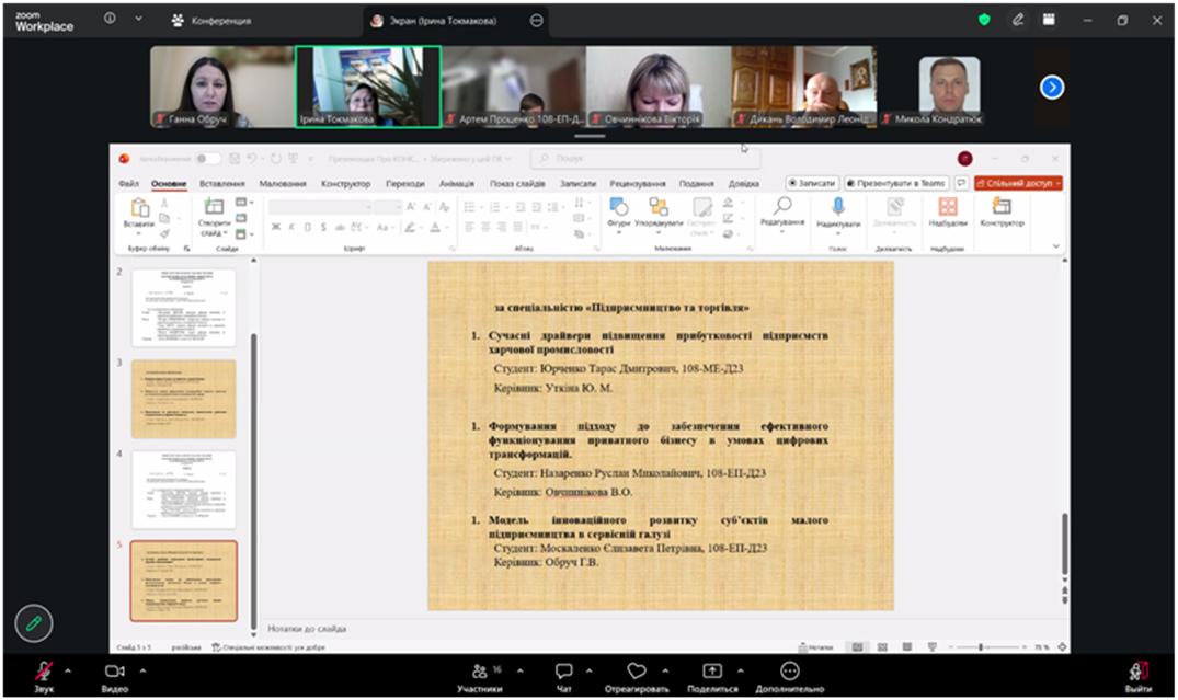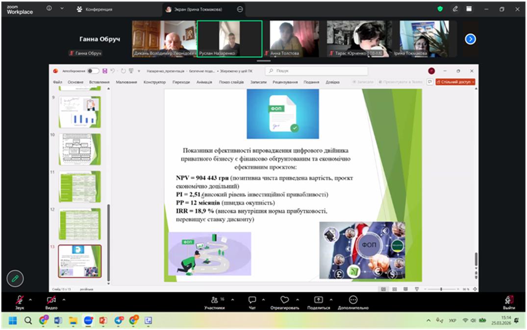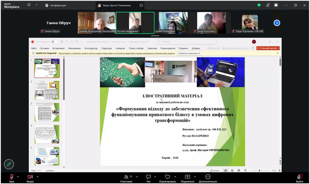 ІІІ місце Руслан НАЗАРЕНКО, студент гр. 108-ЕП-Д23, тема роботи «Формування підходу до забезпечення ефективного функціонування приватного бізнесу в умовах цифрових трансформацій», науковий керівник – професорка кафедри економіки та управління виробничим і комерційним бізнесом, д.е.н., проф. Вікторія ОВЧИННІКОВА.