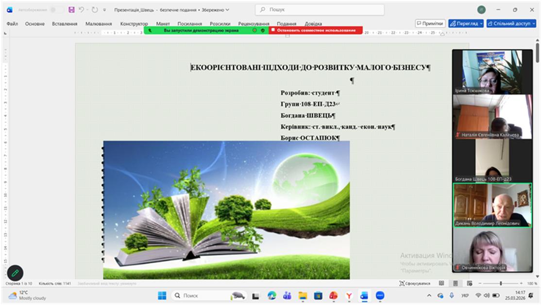 І місце Богдана ШВЕЦЬ, студентка гр. 108-ЕП-Д23, тема роботи «Екоорієнтовані підходи до розвитку малого бізнесу», науковий керівник – ст. викладач кафедри економіки та управління виробничим і комерційним бізнесом, к.е.н. Борис ОСТАПЮК;