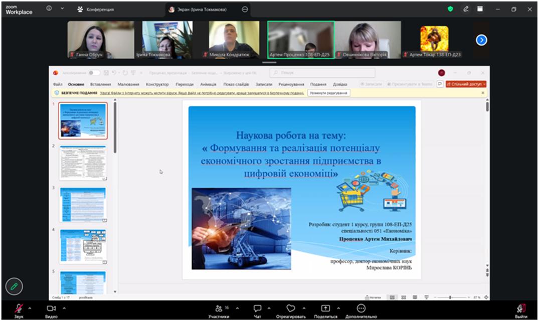 ІІІ місце Артем ПРОЦЕНКО, студент гр. 108-ЕП-Д25, тема роботи «Формування та реалізація потенціалу економічного зростання підприємства в цифровій економіці», науковий керівник – професорка кафедри економіки та управління виробничим і комерційним бізнесом, д.е.н., проф. Мирослава КОРІНЬ;