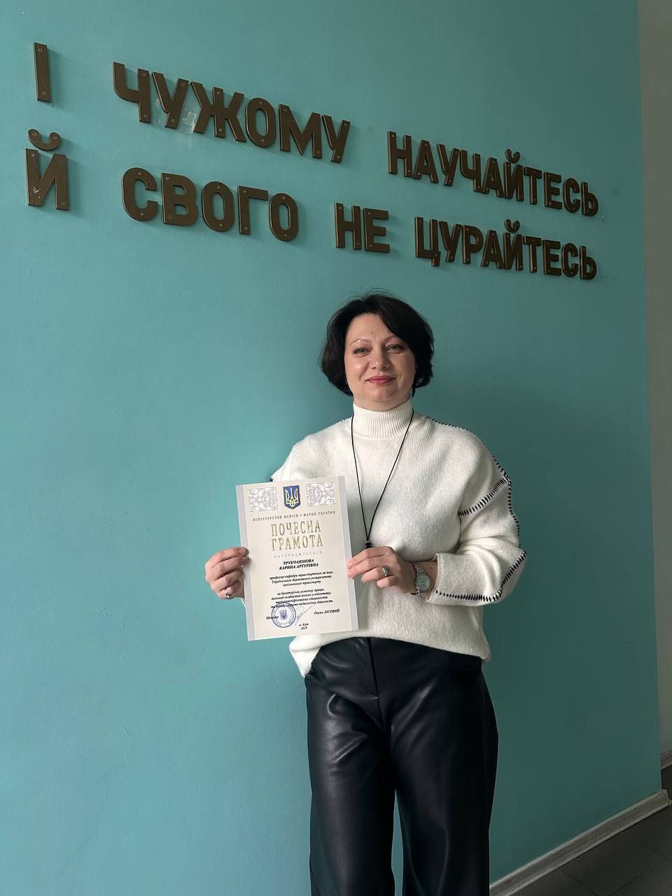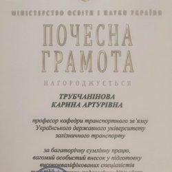 03.11.2025 року – відбулось урочисте засідання Вченої ради Університету, на якому д.т.н., професору Трубчаніновій Карині Артурівні за багаторічну сумліну працю, вагомий особистий внесок у підготовку висококваліфікованих спеціалістів та плідну науково-педагогічну працю було вручено Почесну грамоту Міністерства освіти і науки України.