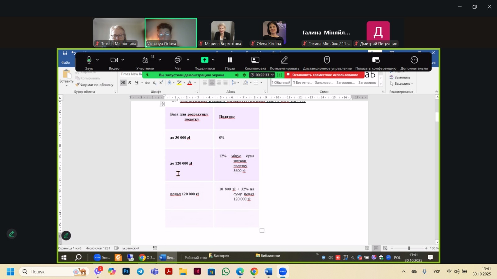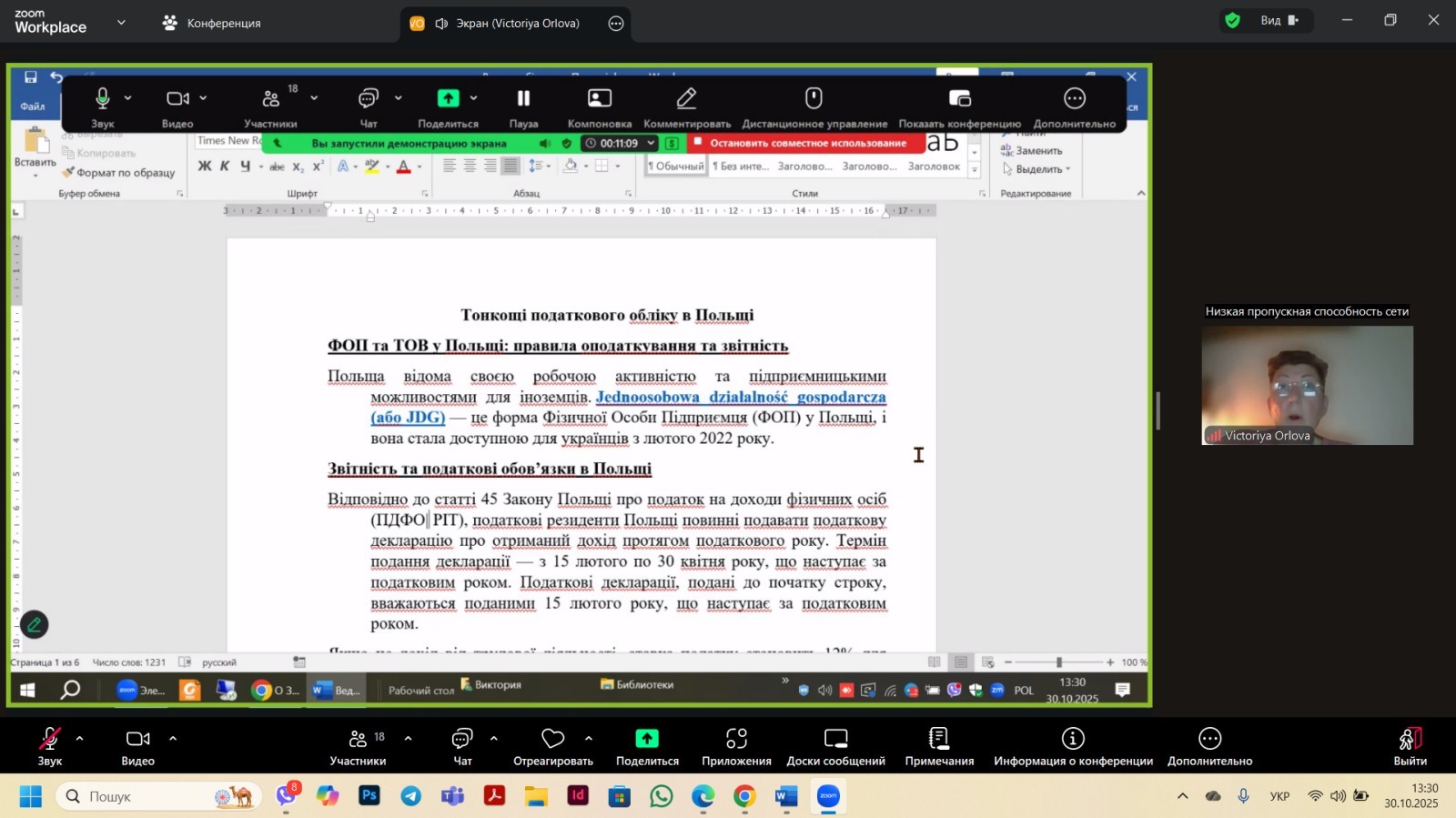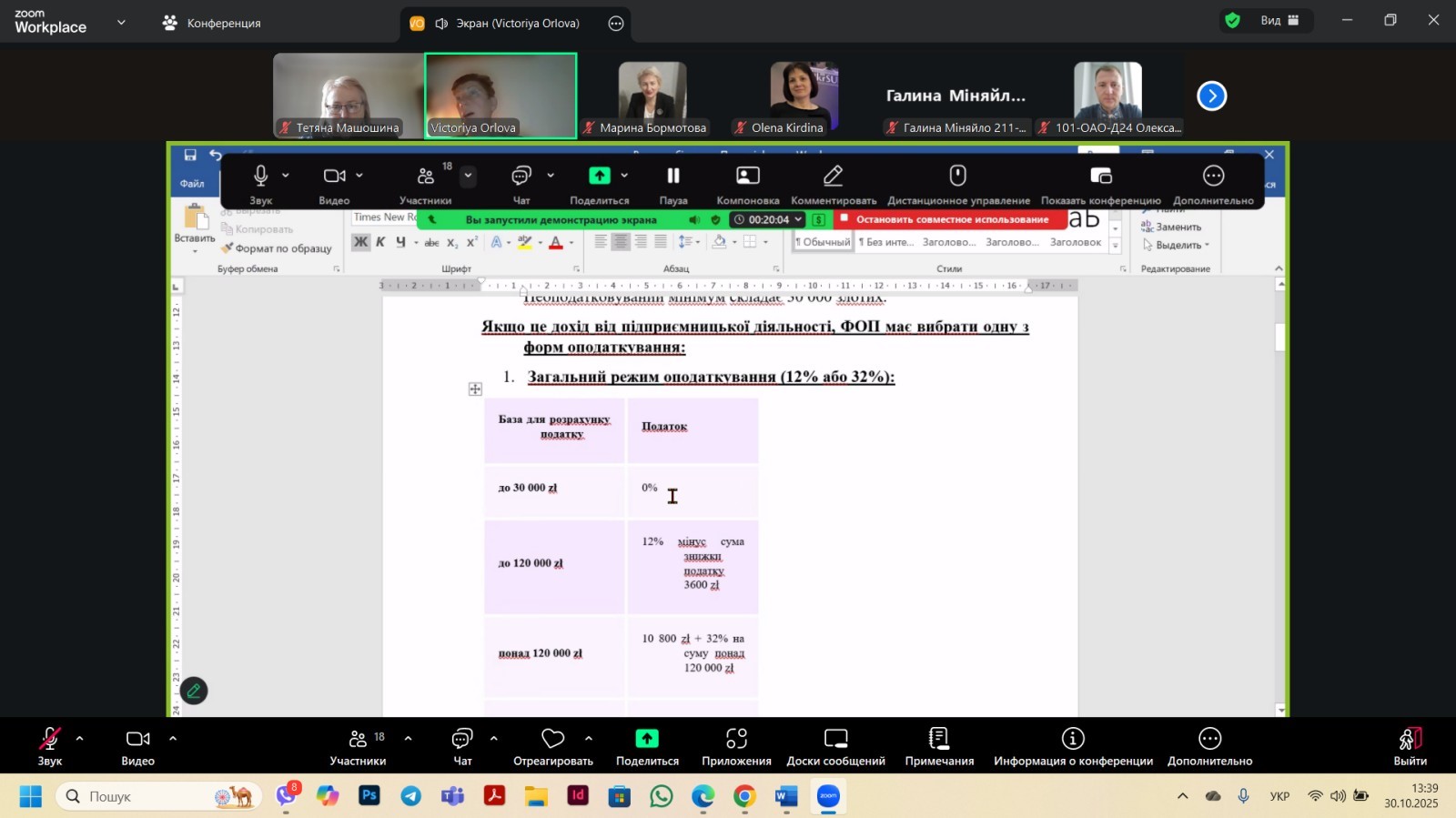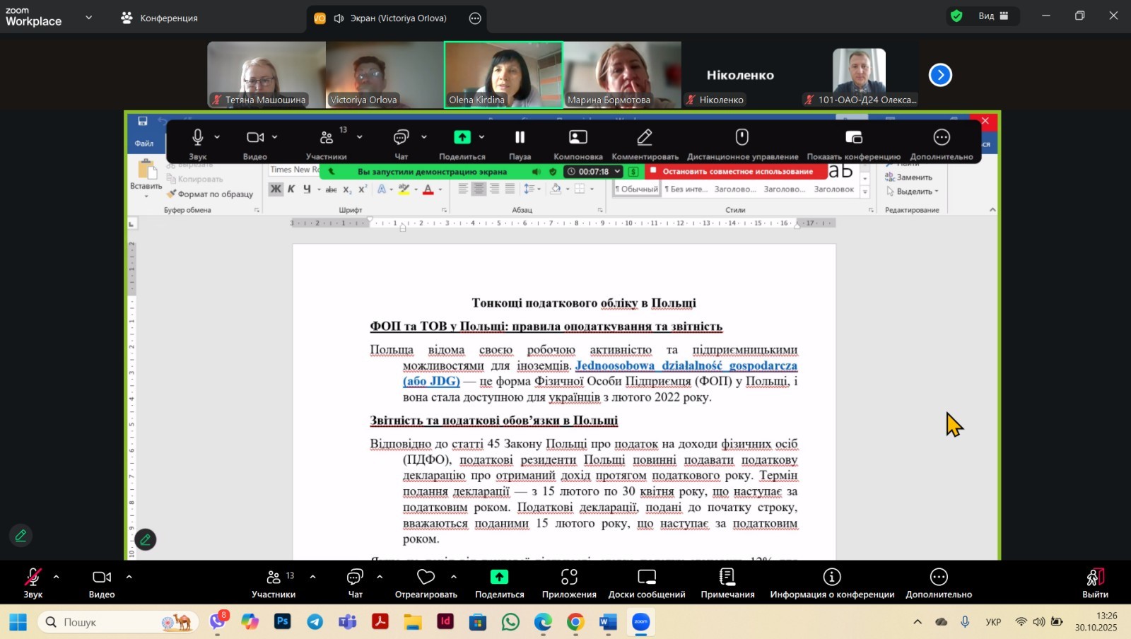 Пізніше була проведена перша частина семінару з поглибленим курсом за такою тематичною рубрикою: ” Тонкощі податкового обліку в Польщі . ФОП та ТОВ у Польщі: правила оподаткування та звітність“. Проведено загальний аналіз податкових систем, який охоплює всі доступні форми оподаткування та враховує актуальні зміни в законодавстві обох країн , а саме податків ПДФО ( Україна) та PIT (Польша) і показує суттєві відмінності у фіскальному навантаженні на індивідуальних підприємців . Виконавець к.е.н., доцент Орлова В.М.