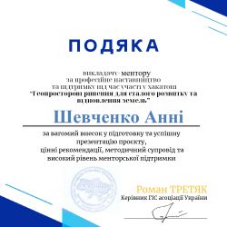 – Шевченко А.О., к.т.н., доцент кафедри – ментор міжнародного конкурсу DigiEduHack 2025 (https://digieduhack.com/challenges/geospatial-solutions-for-sustainable-development-and-land-recovery).