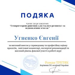 – Угненко Є.Б., д.т.н., професор, завідувач кафедри – член журі міжнародного конкурсу DigiEduHack 2025 (https://digieduhack.com/challenges/geospatial-solutions-for-sustainable-development-and-land-recovery);