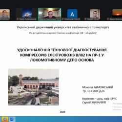 of trains with automatic track-gauge change systems Вікторія СВЄТОШ (108-MBT-Д22) керівник – доц. Ганна КОМАРОВА ; Розроблення комплексу заходів, спрямованих на покращення роботи локомотивного або моторвагонного депо Михайло ЧУГАЙ (221-ЛЛГ-Д24) керівник – доц. Павло ХАРЛАМОВ; Удосконалення технології діагностування компресорів електровозів ВЛ82 на ПР-1 у локомотивному депо Основа Микола ЗАМОЖСЬКИЙ (131-ЛЛГ-Д24) керівник – доц. Сергій МИХАЛКІВ.